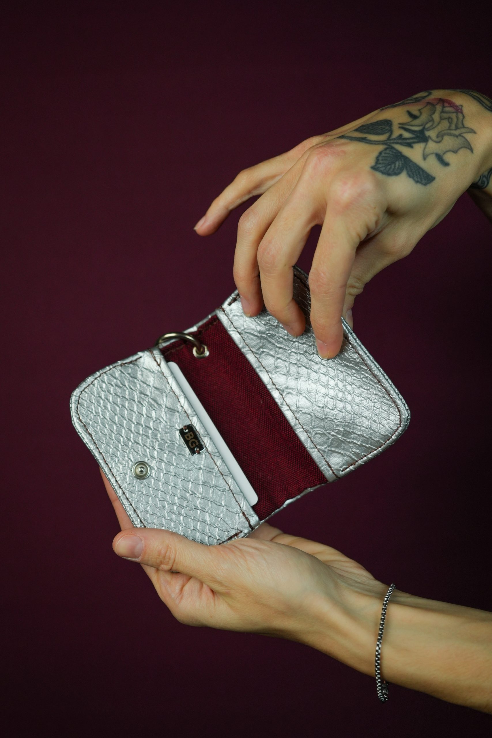 Add a touch of shine to your everyday essentials with this Silver Textured Mini Wallet, thoughtfully crafted from upcycled leftover materials. Its striking metallic finish and realistic textured pattern give it a luxurious look, while supporting a more sustainable approach to design.