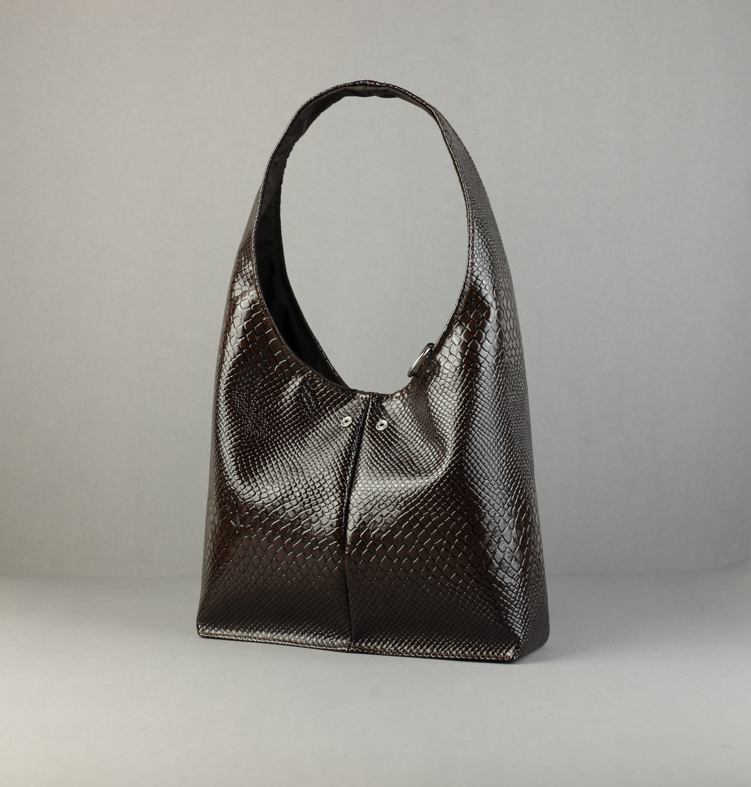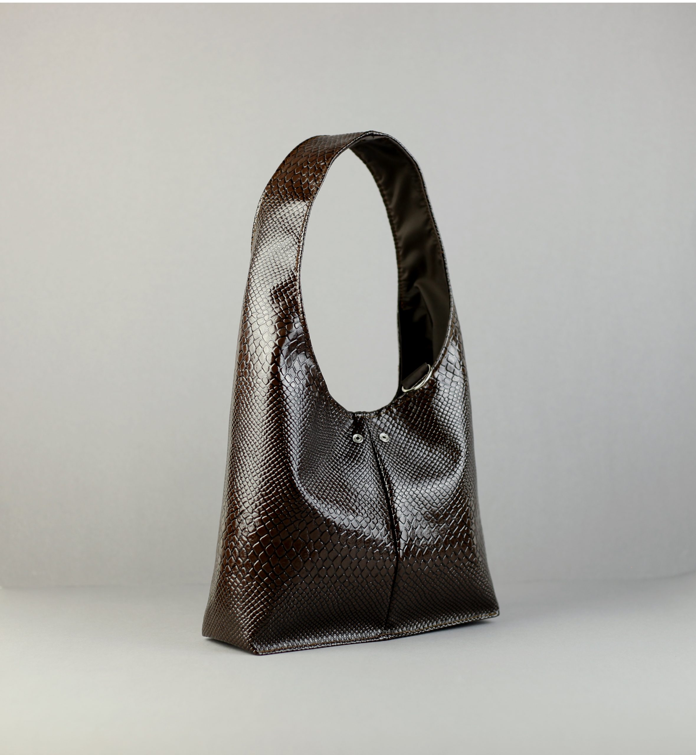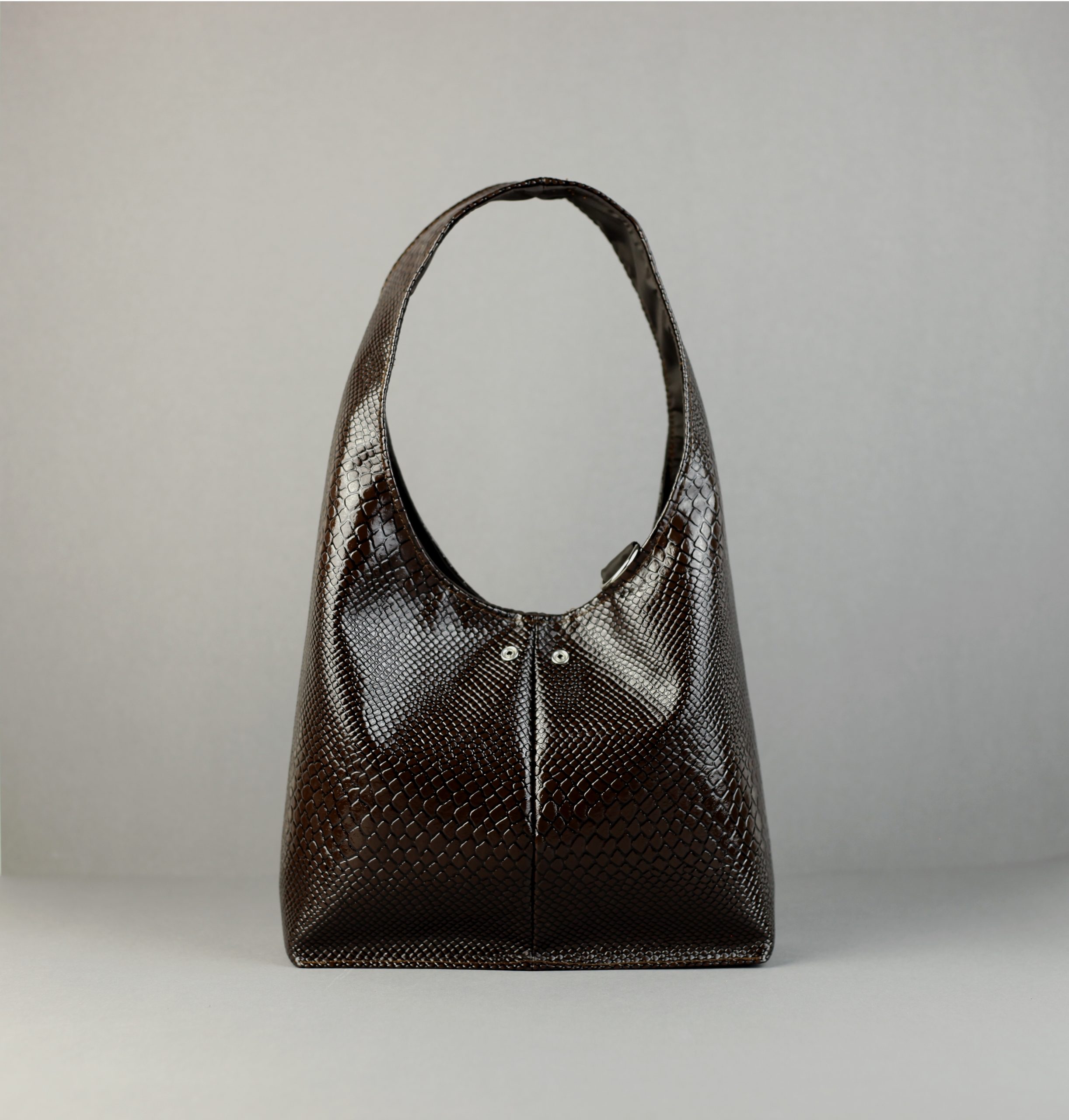 - Side A: Vegan leather snake pattern on a chocolate brown tone