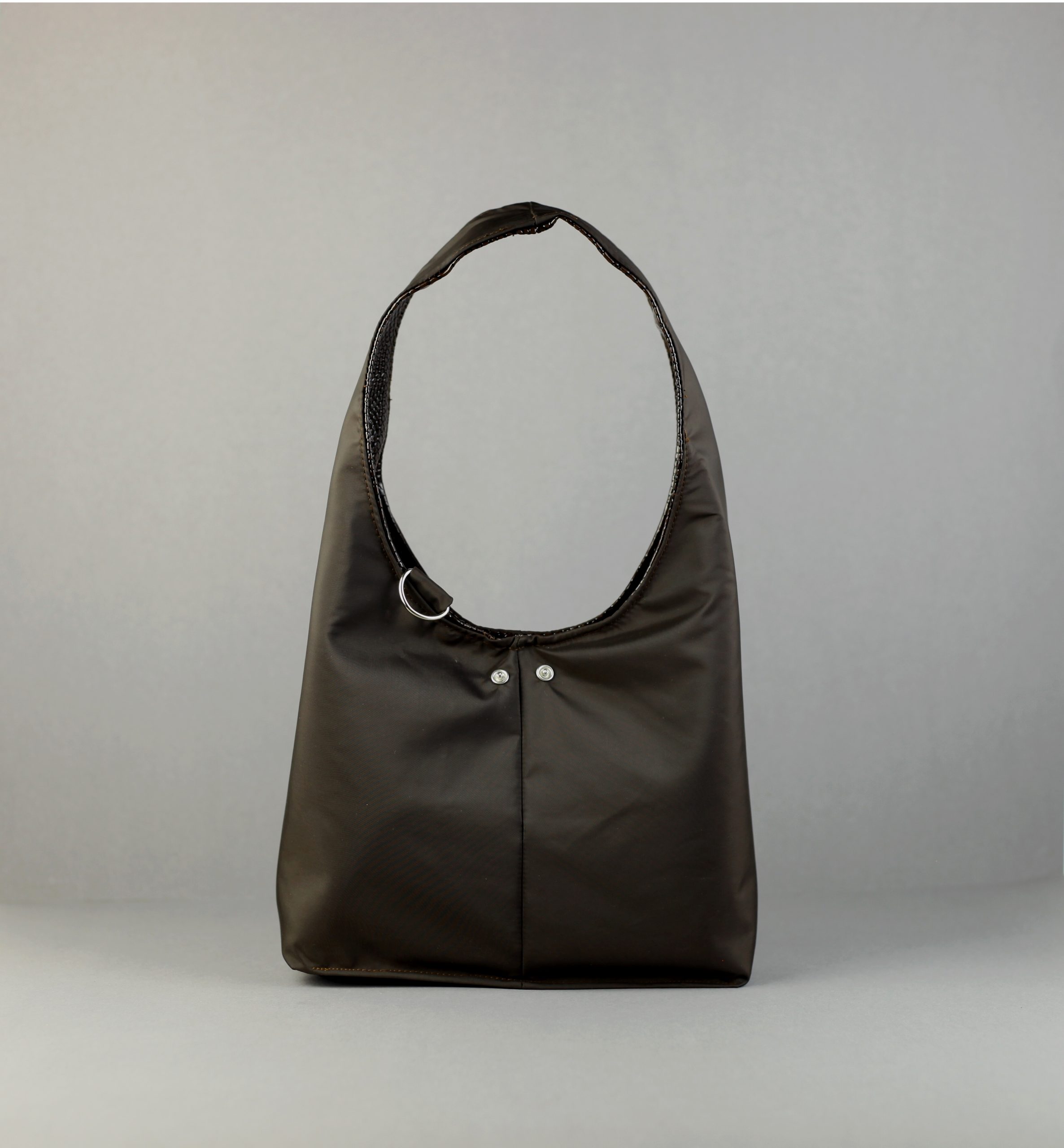 Versatile Reversible Bag, designed to suit your ever-changing style needs. On one side, indulge in the practicality of waterproof matte nylon in a rich chocolate brown hue, offering protection from the elements while maintaining a sleek aesthetic. On the flip side, elevate your look with durable vegan leather featuring a striking snake pattern in complementary chocolate tones, adding a touch of sophistication to any ensemble. Each bag is equipped with a metal ring and keychain for added convenience. Available in both small and large sizes, our reversible bag offers versatility and functionality for every occasion.