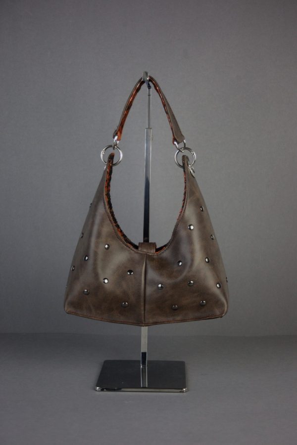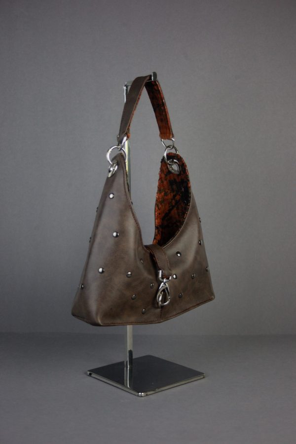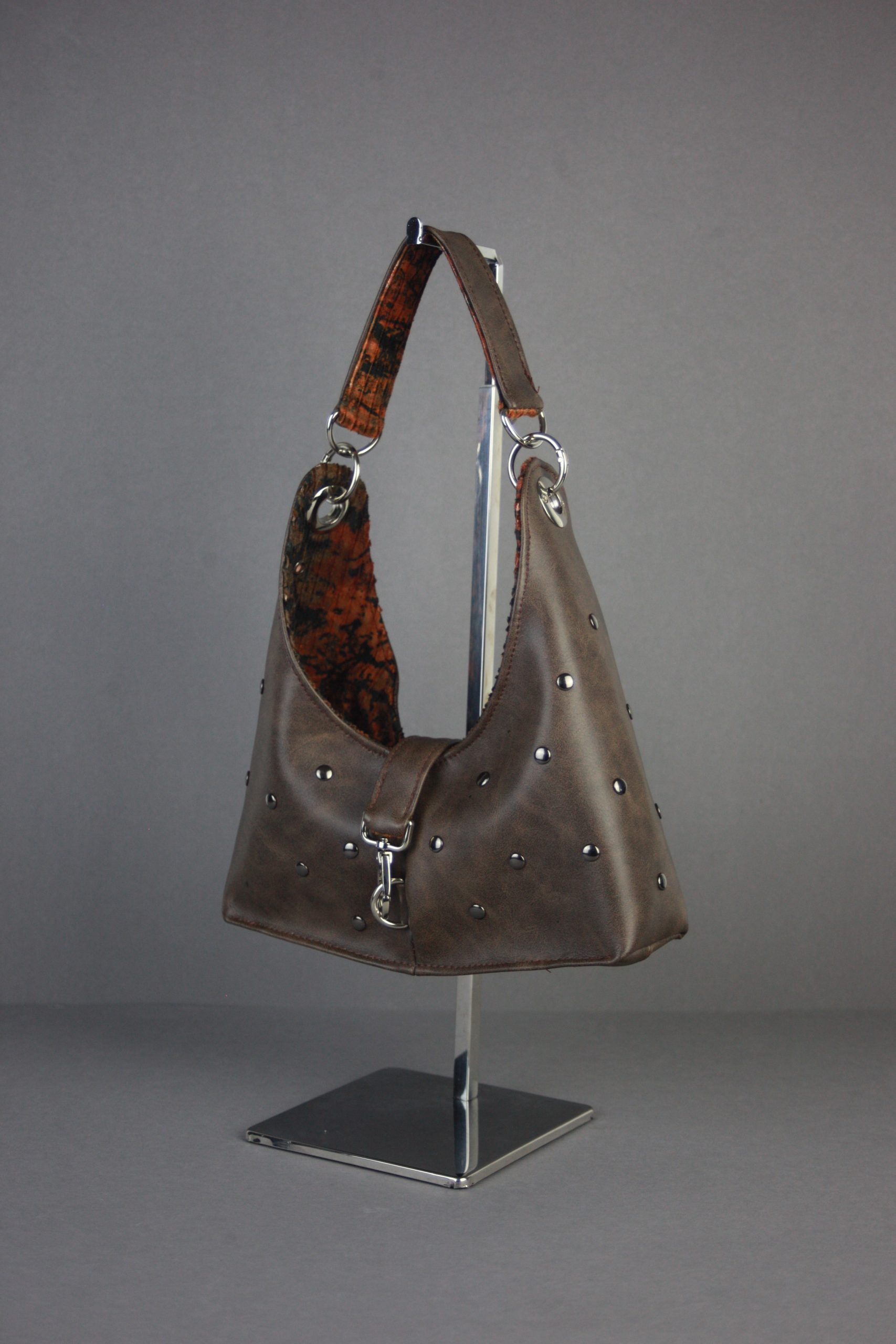 On the other side, showcases eco-friendly vintage vegan leather with a unique knotted diamond pattern, accented by polished chrome stainless steel rivets for a bold, modern touch.
