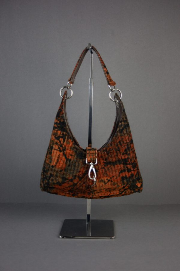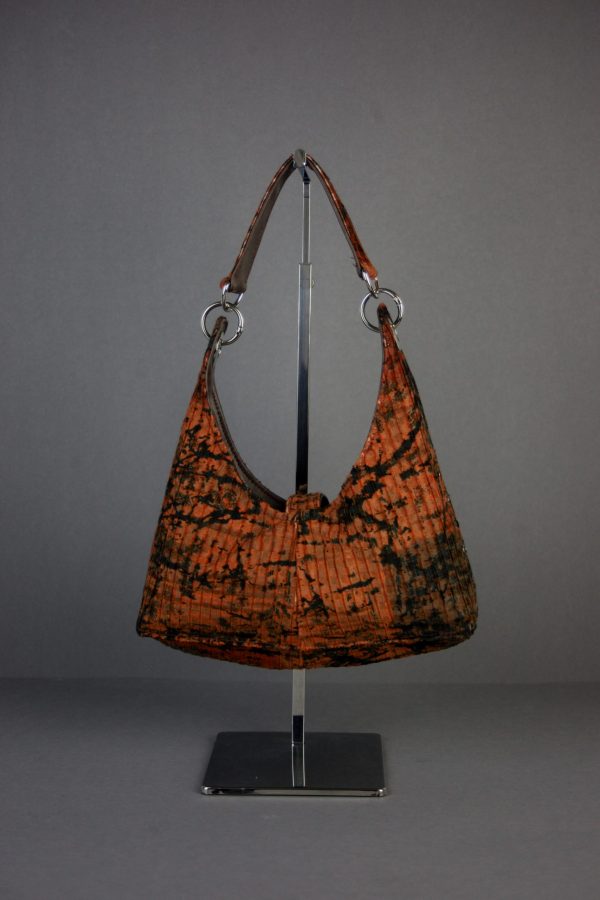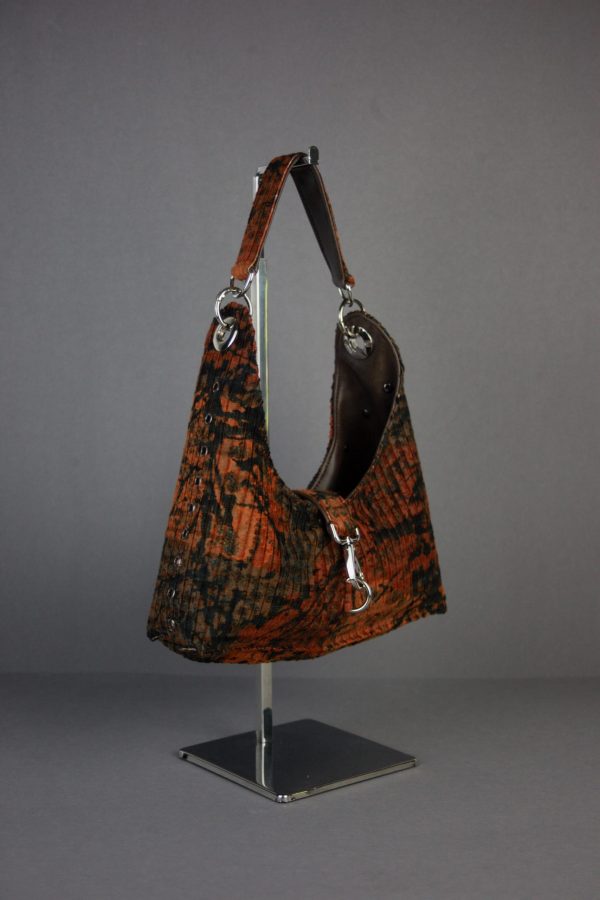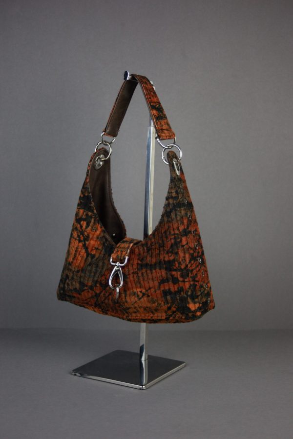 One side a very unique fabric imported from Ibiza, Spain. Richly textured velvety corduroy, this fabric showcases a striking hand-dyed pattern in earthy rust and deep charcoal tones. The irregular, organic print adds a sense of movement and depth, giving each piece a unique visual identity. Soft to the touch yet structured, the material provides a perfect balance between comfort and durability. The fabric’s ribbed surface subtly reflects light, enhancing its vintage-inspired look while maintaining a modern, bold edge.