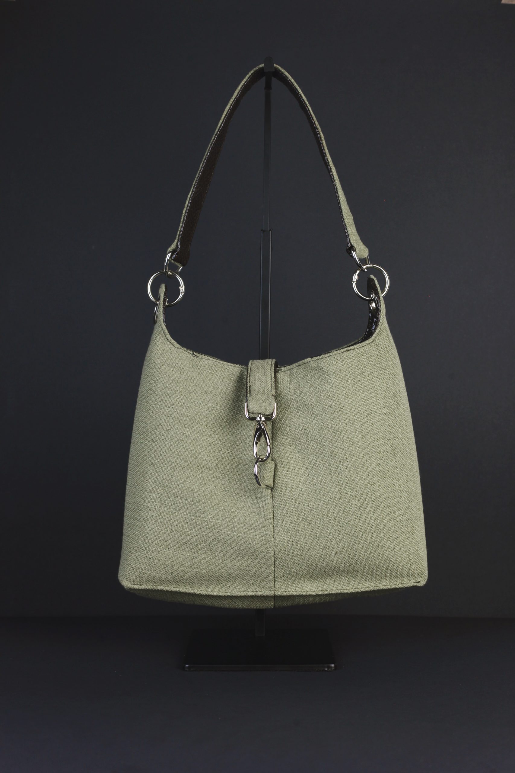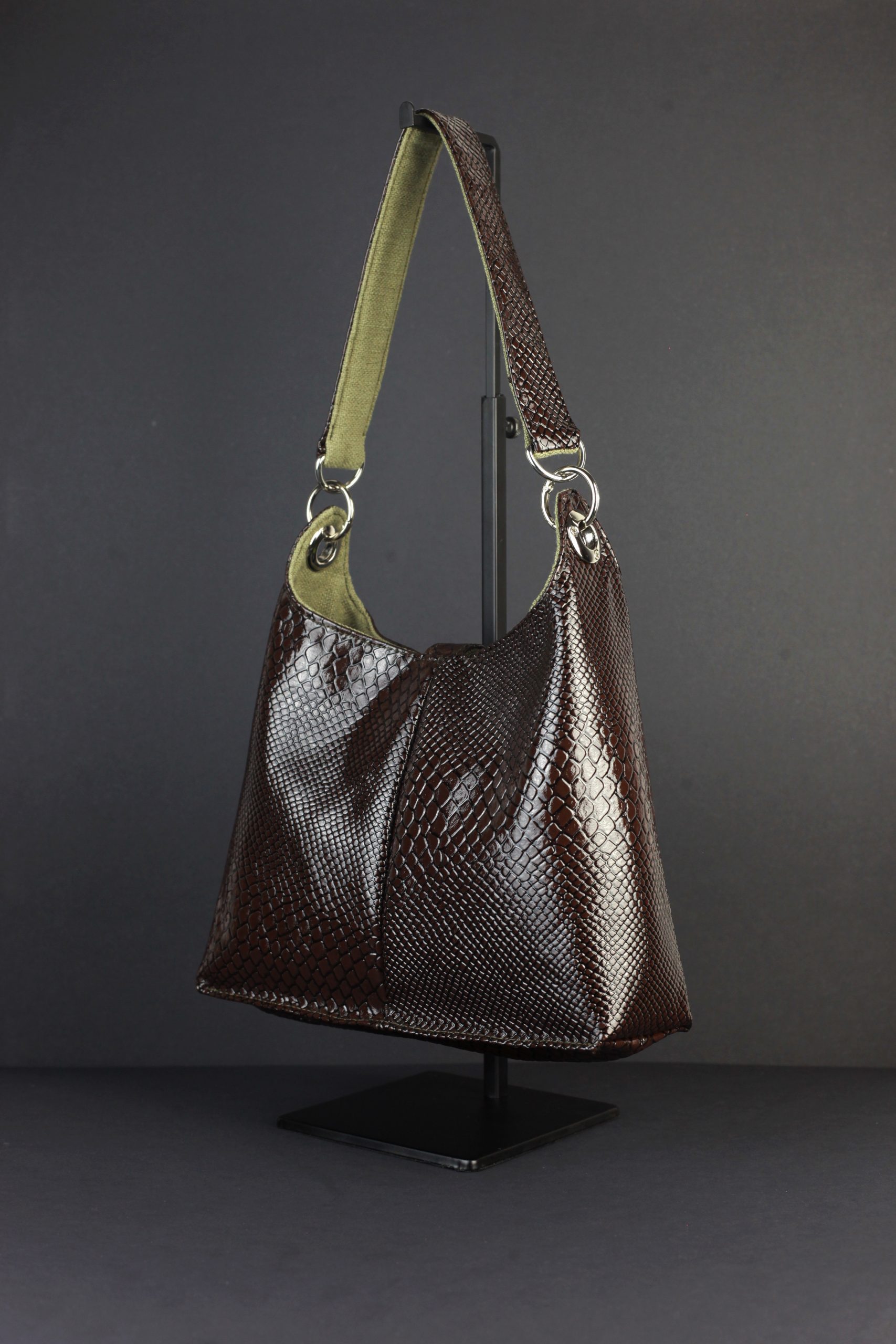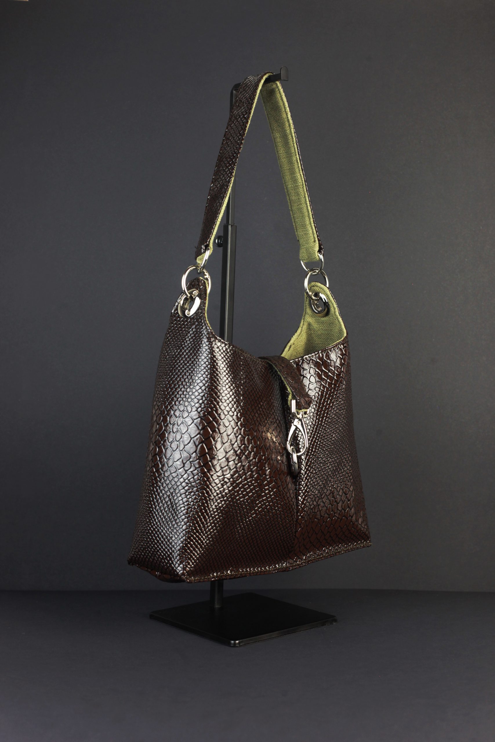 Versatile Reversible Bag, designed to suit your ever-changing style needs. On one side, with durable vegan leather featuring a striking snake pattern in complementary chocolate tones, adding a touch of sophistication to any ensemble. On the flip side, Natura linen-look upholstery fabric in contemporary colours. Natura is a very stable upholstery fabric of the latest generation with original stain protection and strong backing, which gives the quality additional volume and makes it very hard-wearing