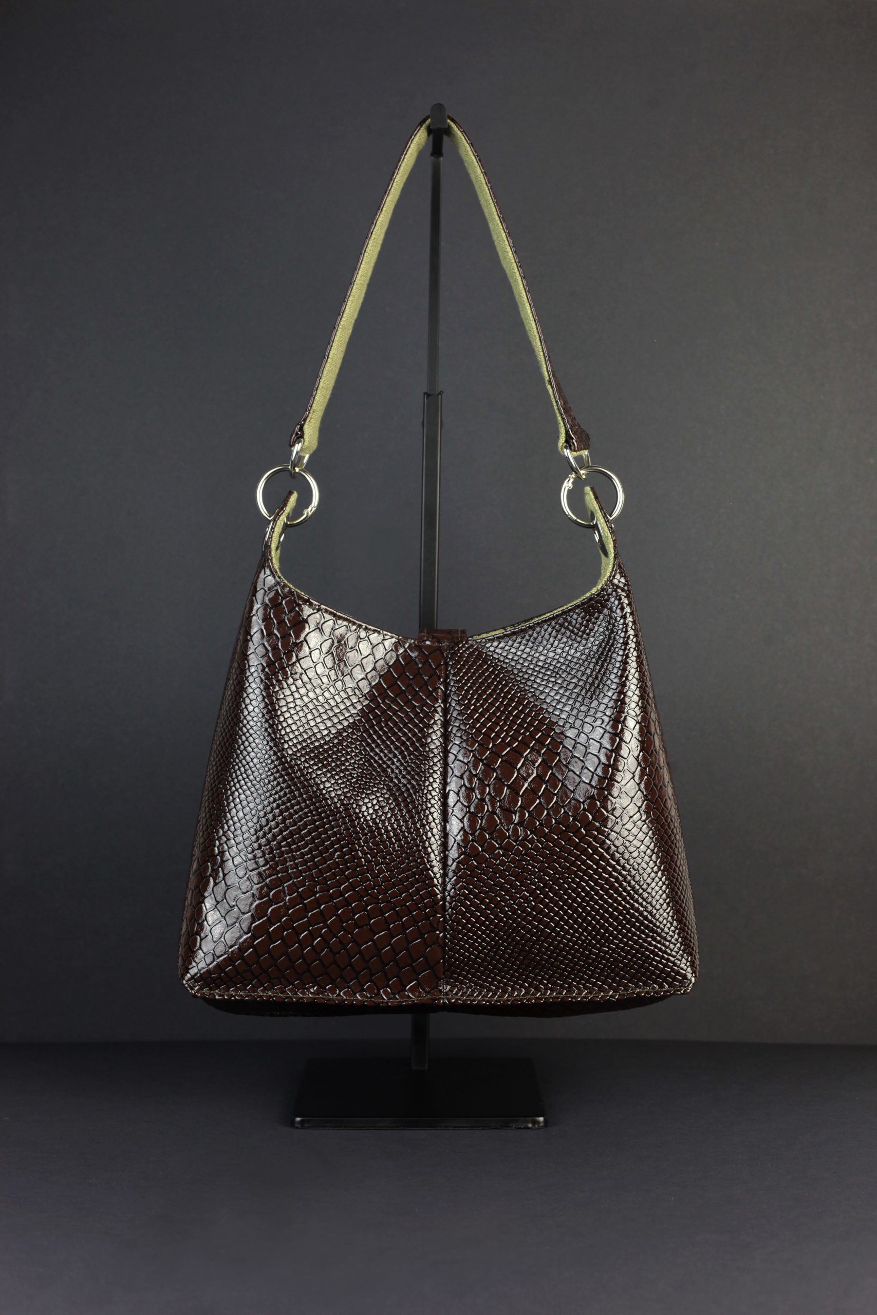 - Side A: Vegan leather snake pattern on a chocolate brown tone