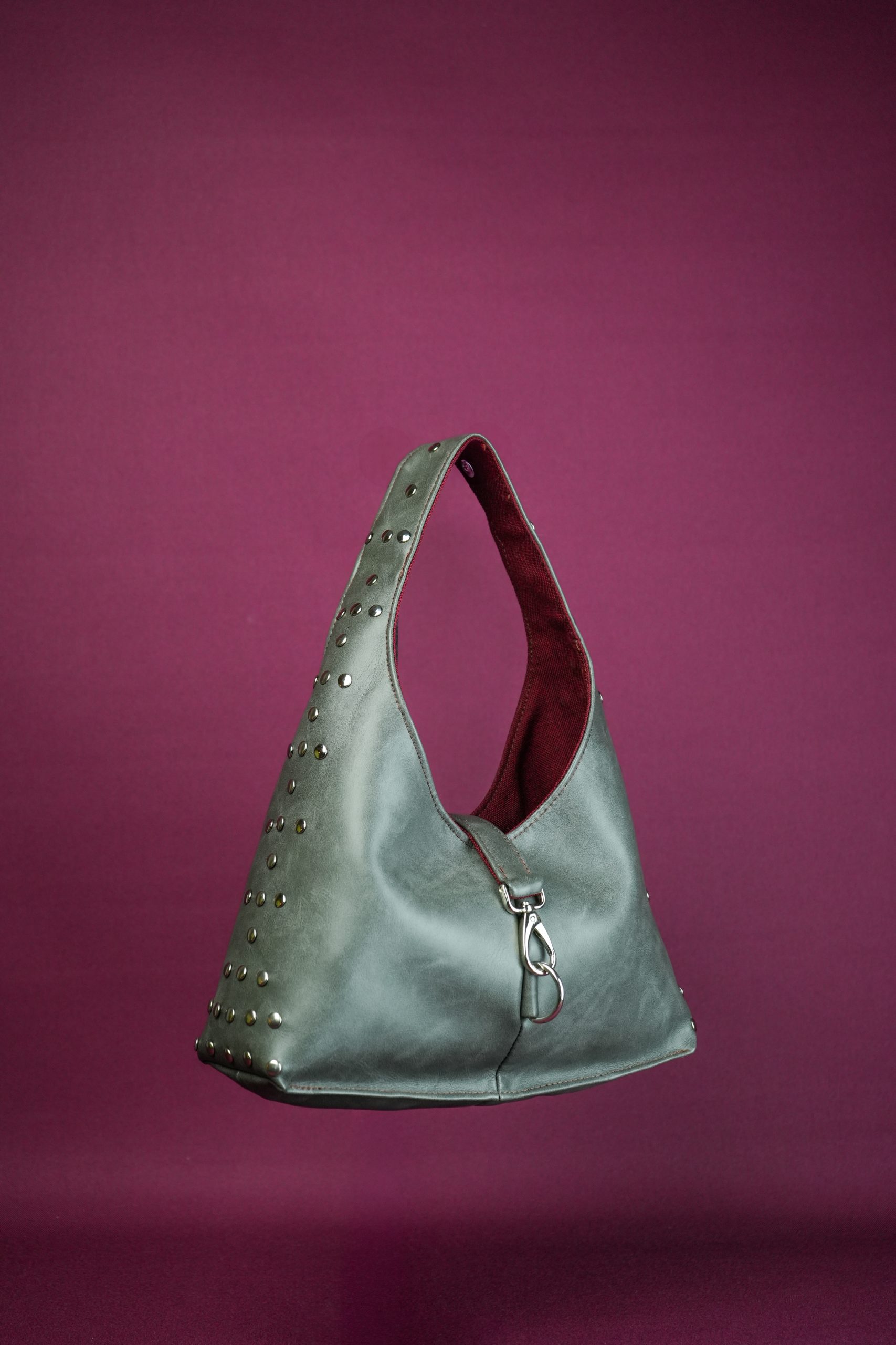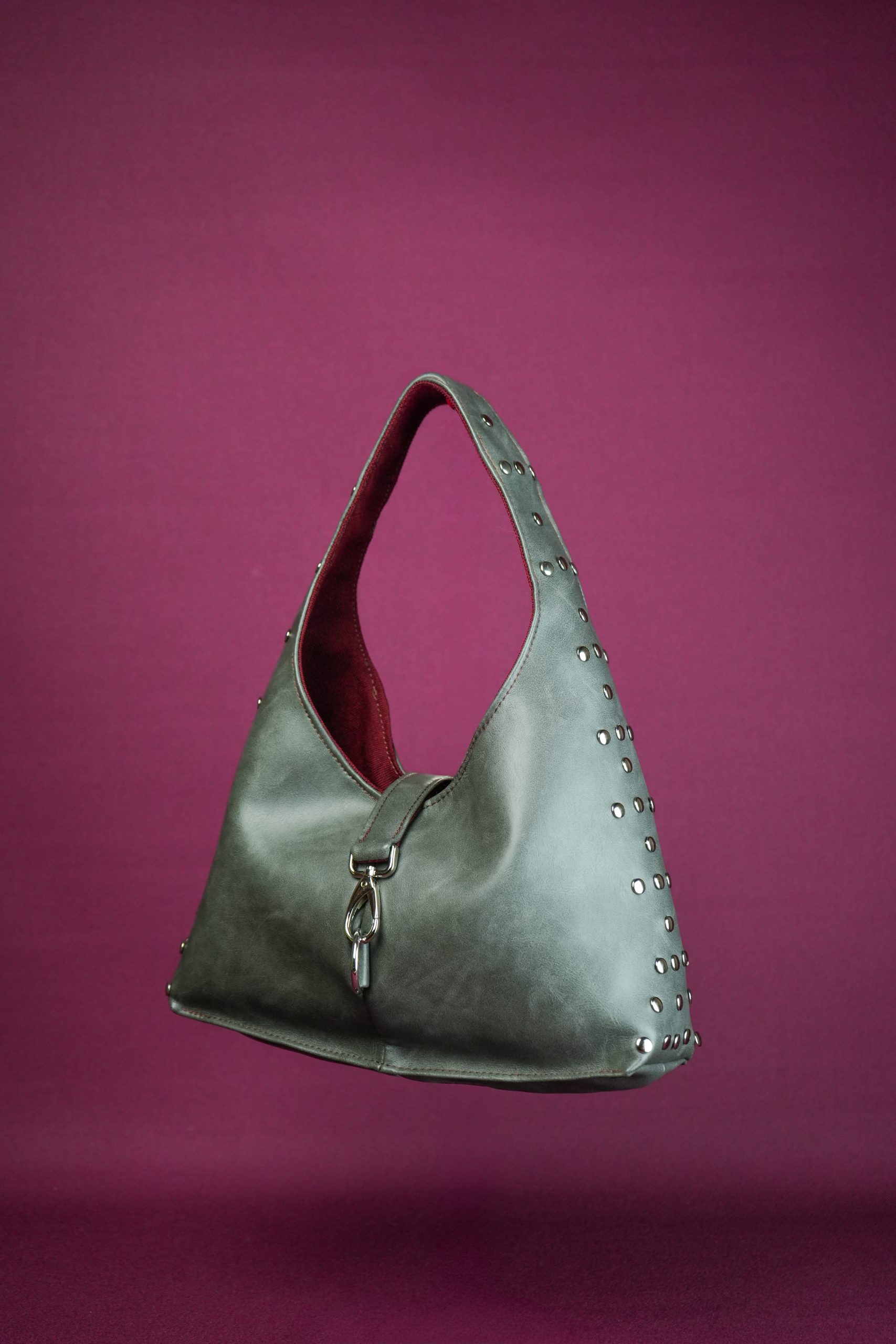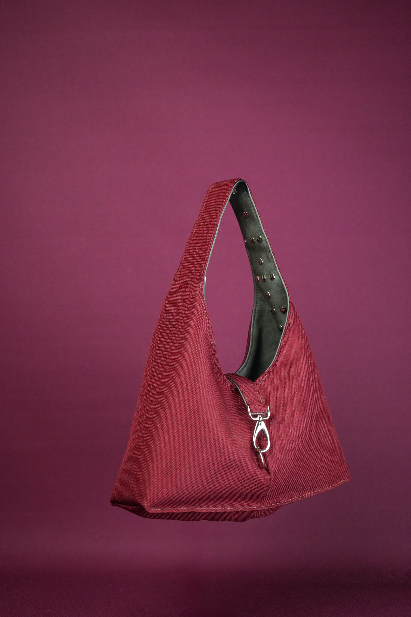 Versatile Reversible Bag, designed to suit your ever-changing style needs. On one side, an Eco-Friendly Vintage Vegan Leather with Knotted Diamonds Pattern with stainless rivets in silver.