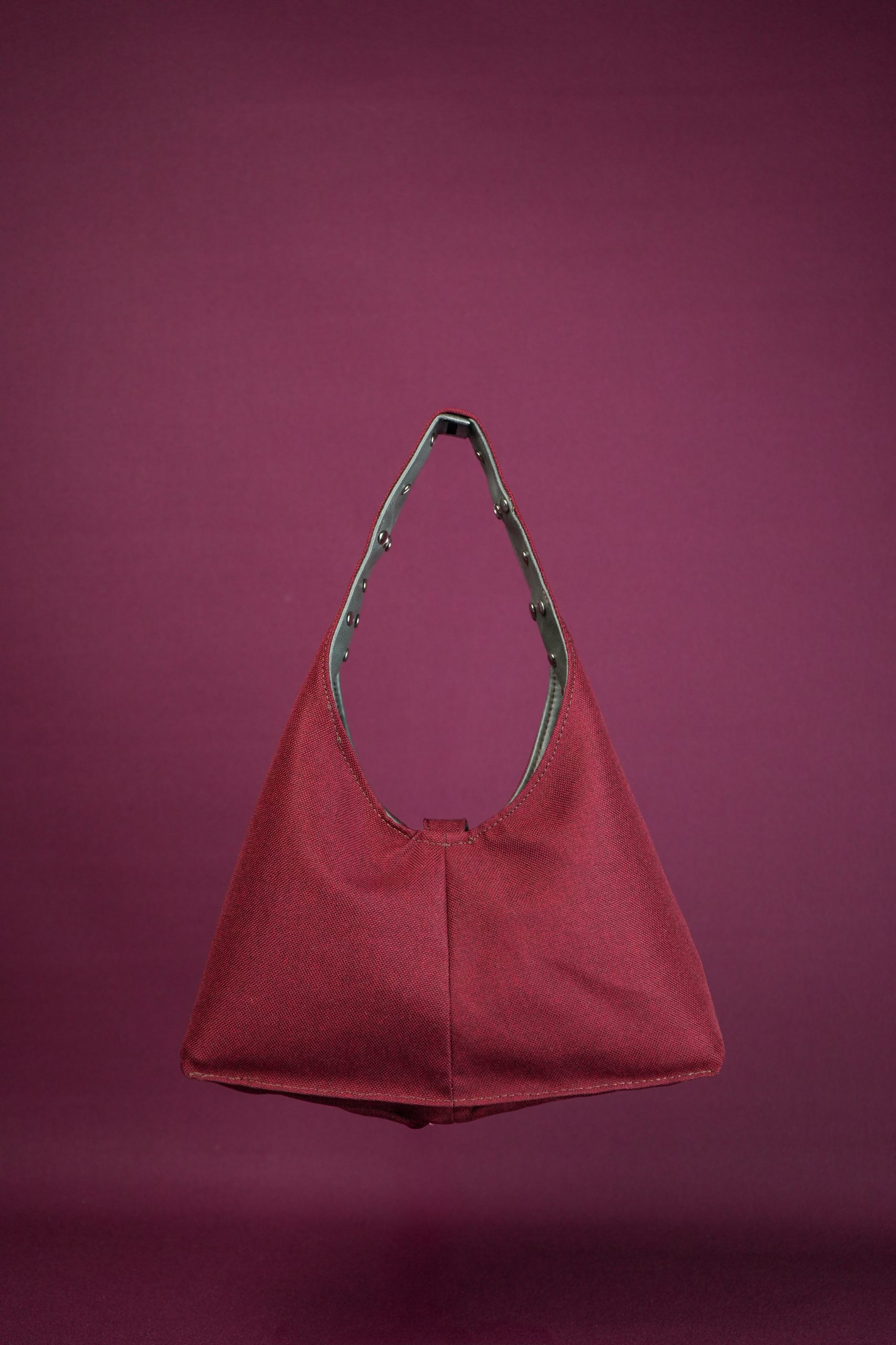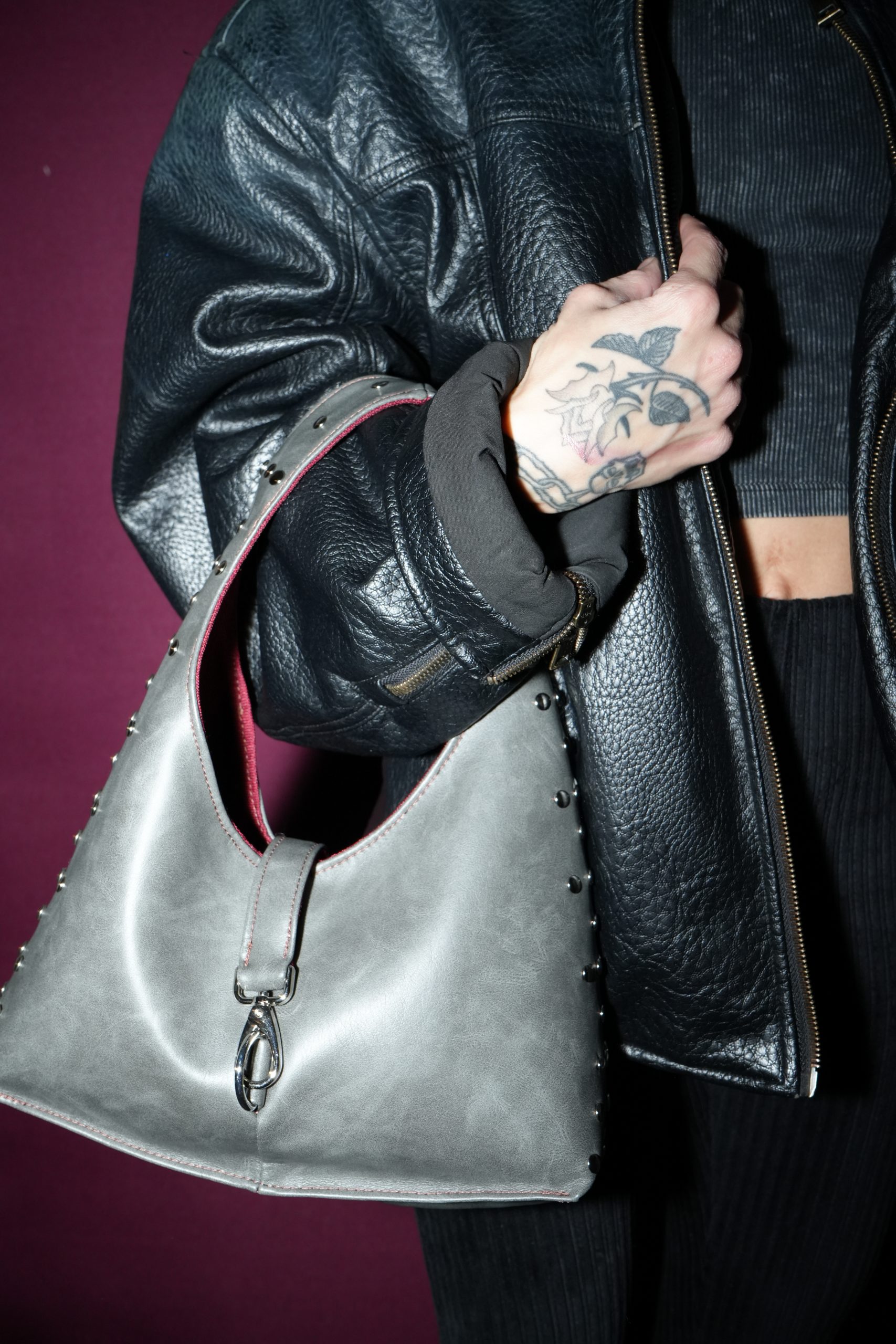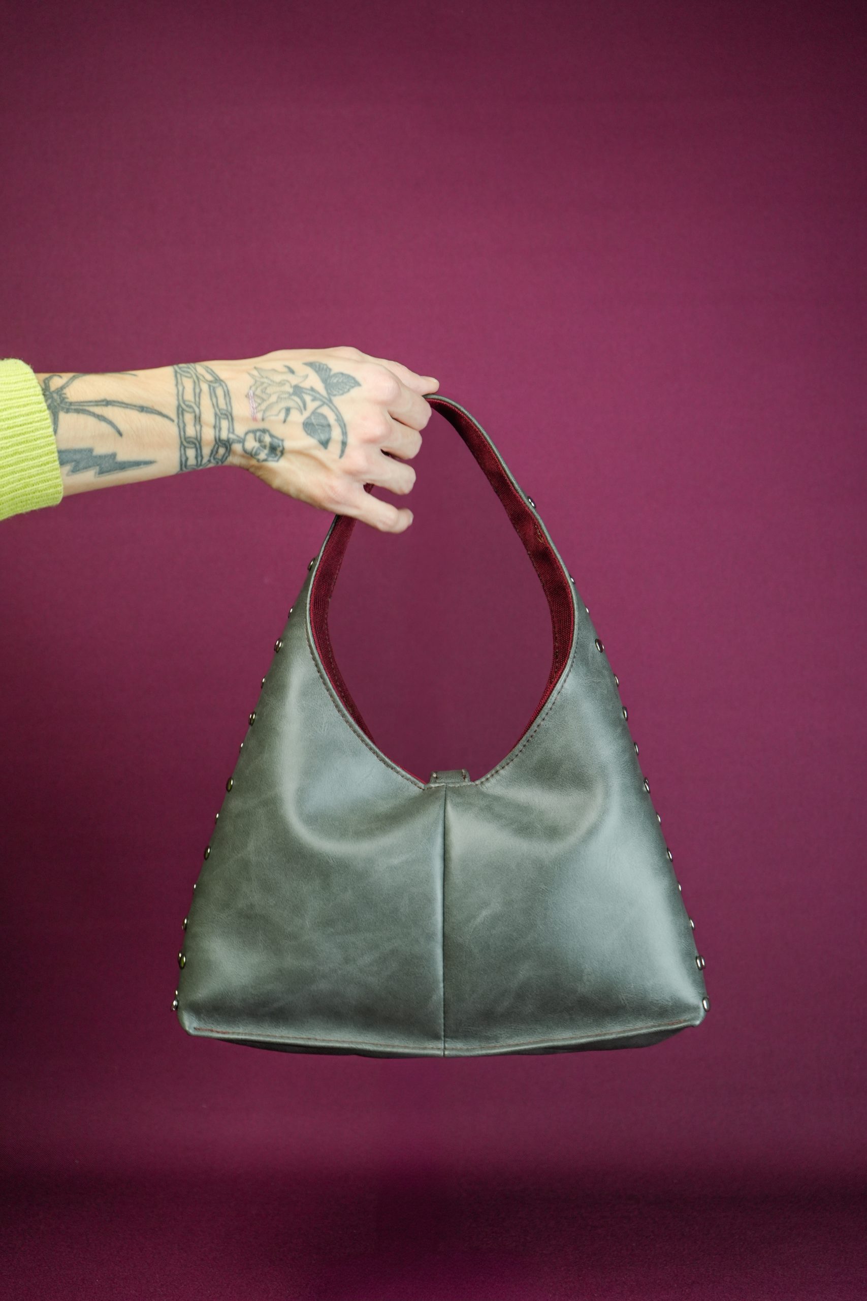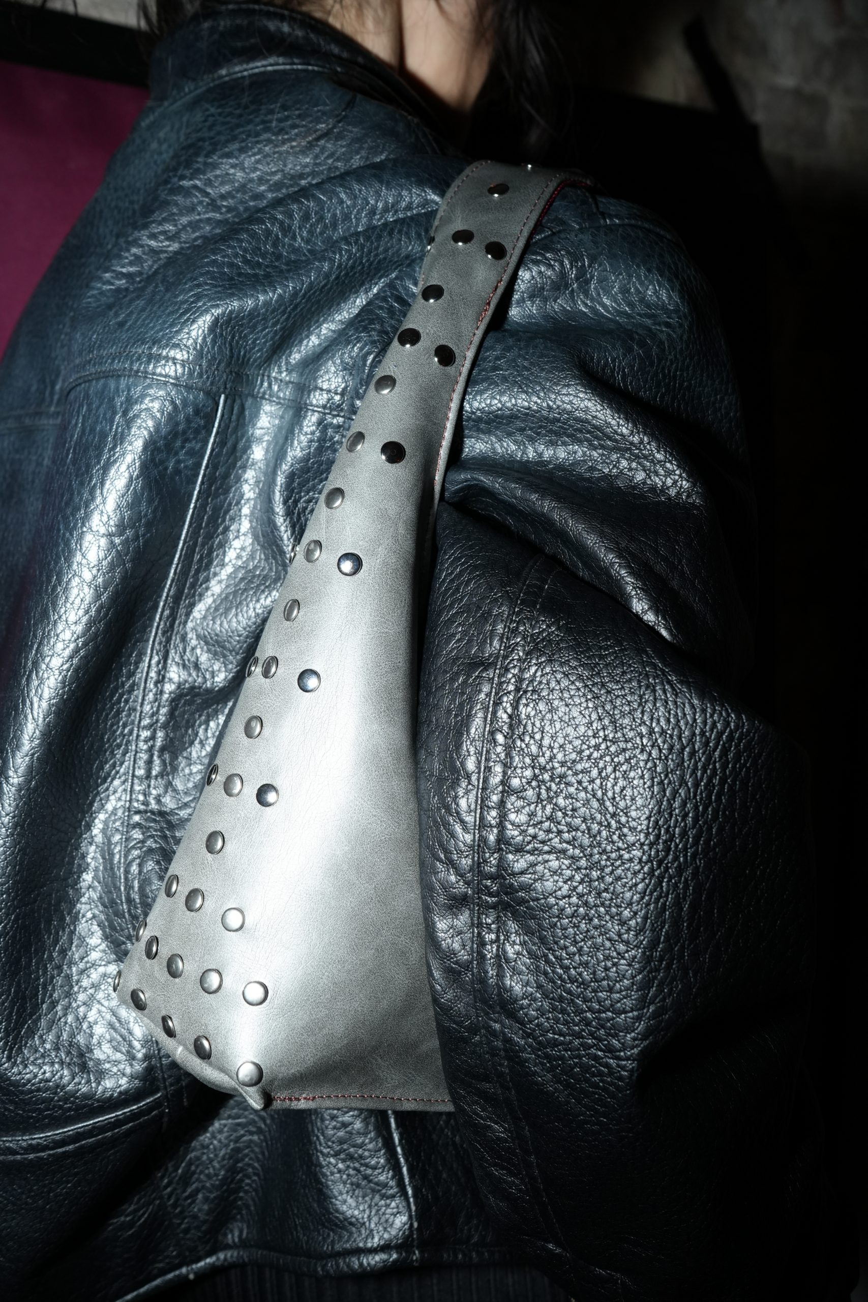 Versatile Reversible Bag, designed to suit your ever-changing style needs. On one side, an Eco-Friendly Vintage Vegan Leather with Knotted Diamonds Pattern with stainless rivets in silver.