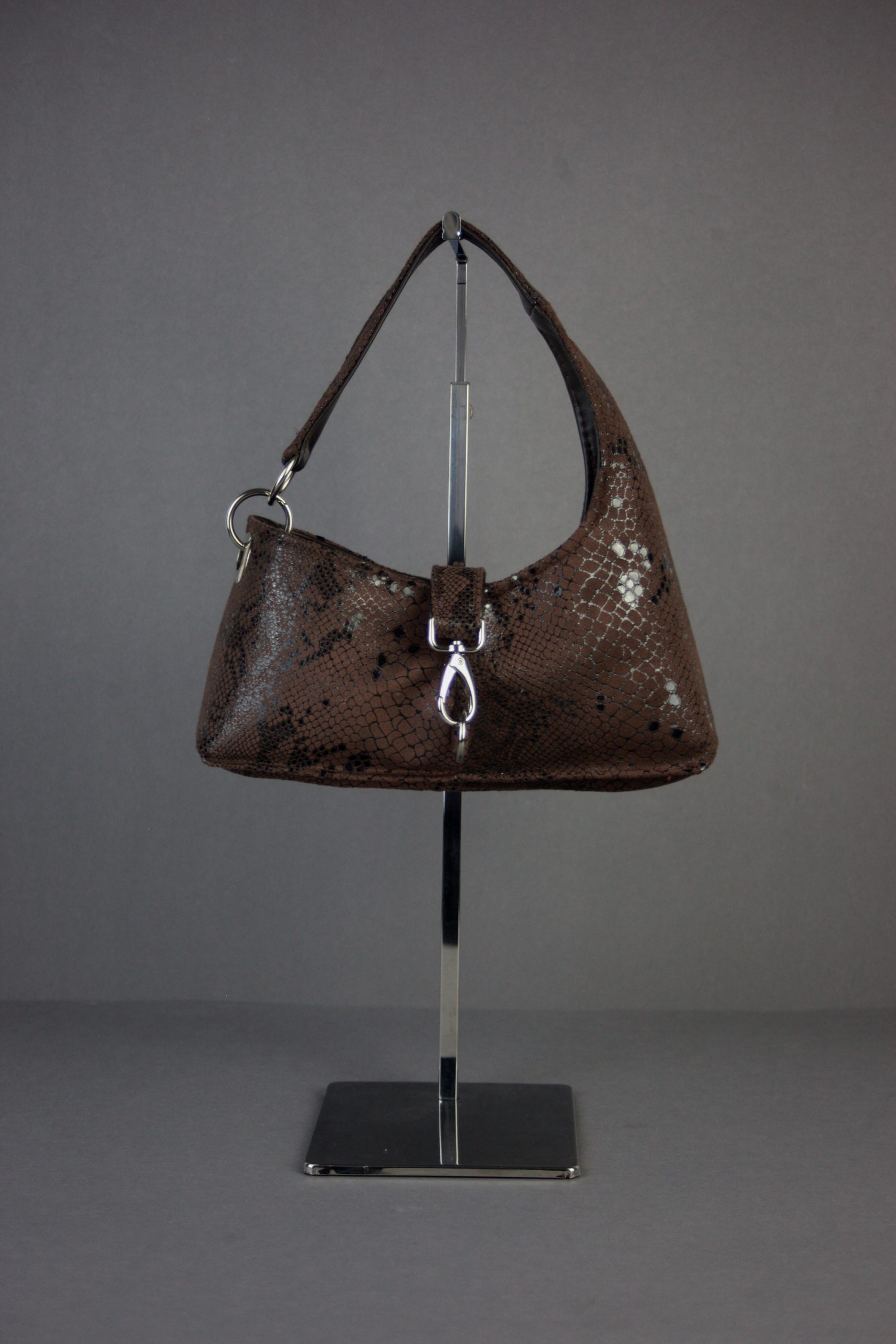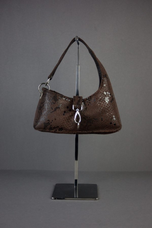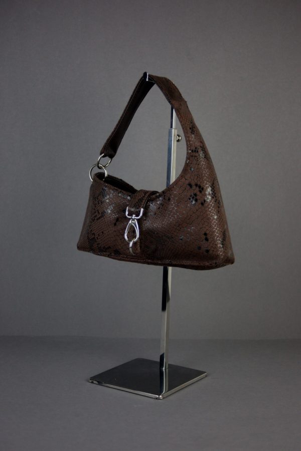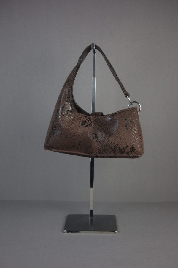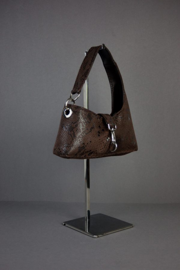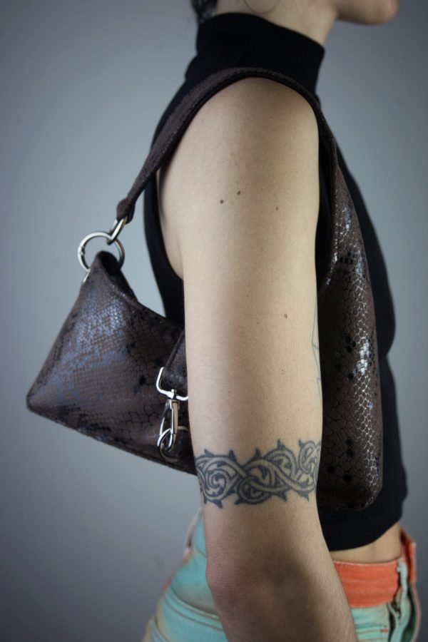 On the other side, a very unique fabric with a python snake look and a unique feel in brown tone with black shiny details, adding a touch of sophistication to any ensemble.